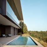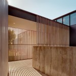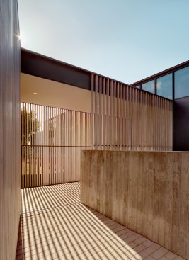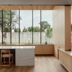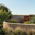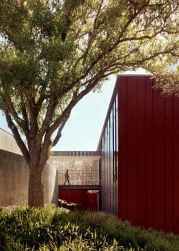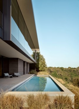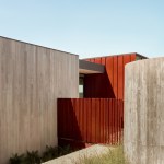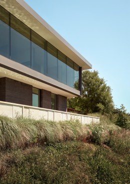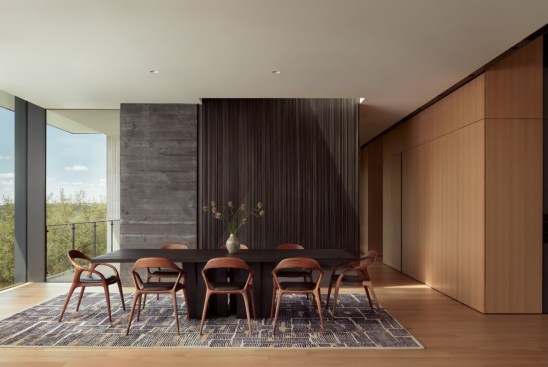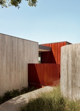 Turning around from the open-plan living and dining room spaces, one ends up in the kitchen, also glazed but overlooking the entry courtyard. From within the courtyard, the mélange of materials used to construct and clad the house—board-formed concrete, wood battens, Corten steel, native stone, and glass—becomes evident. It’s an exterior designed to mature over time along with the surrounding landscape.