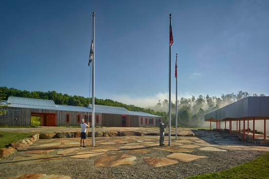 The project comprises three main components: a headquarters building with meeting spaces and camper amenities; a flag plaza for ceremonial events; and an open-air pavilion for large assemblies, performances, and general lounging. The underlying design language “is really rooted in traditional camp structures,” Sanderson says, with the headquarters taking the form of an oblong barn-like volume topped by a gable roof and clad in weathered wood. What grabs the visitor are the window and door frames, outlined in eye-popping orange—“a wayfinding element for the entire site,” says Sanderson, and one that distinguishes Delta from the five other color-coded sites sprinkled throughout the former strip mine. Besides adding a visual identity, the orange also punctuates the rustic vernacular with a stirring bit of modernity, particularly in the pavilion, a more abstract form whose zigzagging ceiling under a flat roofline is a veiled reference to the mountain range visible from the raked hillside seating.