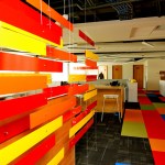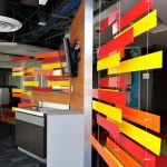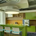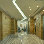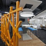 Also located on this floor is the reception area which has a staple with a stone finish and the BASF logo on the back wall. With its waiting area and turnstiles with scanners giving access to users, it will service the entire building.