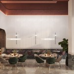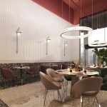 Thanks to the use of different textures of wall decoration, each zone of the space is different from the other, the height of the room is visually reduced, which makes it homely. According to the same principle, the floor covering is implemented, in which contrasting color areas visually separate different functional areas of the restaurant.