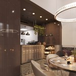 An actual modern solution is a ceiling with open communications. This technique allowed to optimize the implementation budget and use the released funds for spectacular design elements. The open ceiling is delicately illuminated by many minimalist lamps with metal finishes. Many delicate sconces, hidden lighting placed in the arches, create intimate gentle lighting and set the appropriate character of the space. Exquisite accents are rounded flat crystal lamps with copper edges that fall over each round central table. The lighting is soft and gentle, creating an atmosphere of relaxed comfort and complete relaxation from routine.