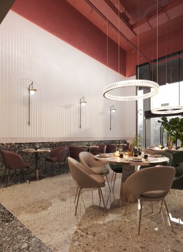 A pastel palette of shades served as the basis of the color scheme – muted and not too bold tones that breathed nobility and a light vibe of luxury into the space. This mood is enhanced by copper details on chairs, tables and lamps. The room organically combines the terseness of natural textures in the interior elements: metal, stone, natural colors and accent arches.