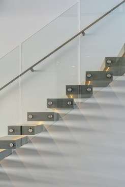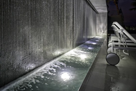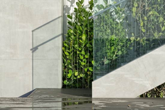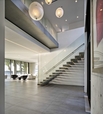 A massive pier of exposed concrete vertically penetrates and effectively anchors the home’s two upper levels. This pier is accompanied by two smaller exposed concrete ‘fins’ that serve as additional structural supports. These ‘fins’ also effectively modulate and randomize the walls of glass facing the bay.