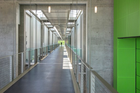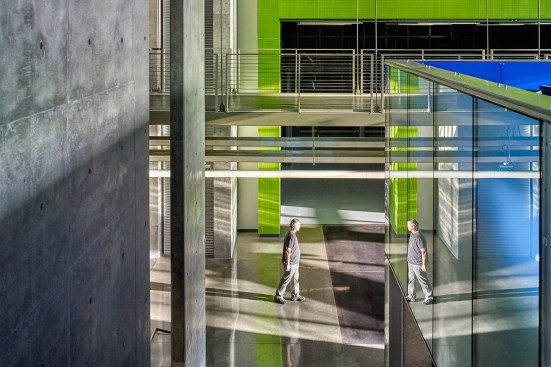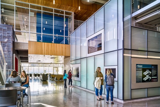 The building uses transparency on many levels to expose and express systems and programs as learning tools. The main building server resides in a 2-story glass tower and functions as an immersive teaching space. An interactive U Tube Cube promotes social learning and is a podium for walk-up access to media, student work, and interaction.