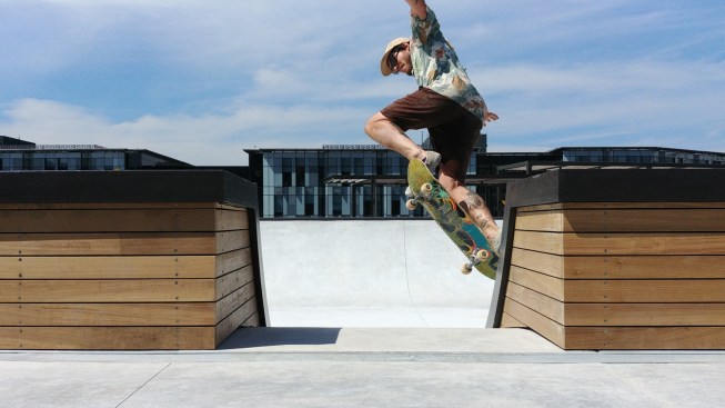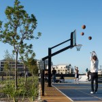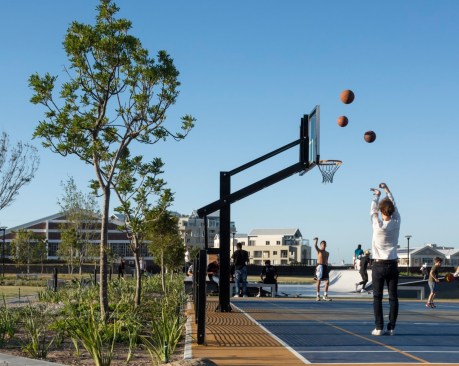 On the elevated park level, visitors can explore landscaped gardens with trees and stone-clad planters, meandering walkways with built-in benches, a concrete skatepark, basketball court and new pedestrian routes. Throughout the park and piazza cantilevered steel pergolas scale the design and provide much-needed shade.