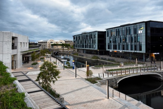 The requirement to respect the original inner courtyard datum and create a lower-level piazza resulted in an elevated park with views across the V&A and CBD but with the challenge of managing the transition between the two levels. Therefore, a large part of Battery Park’s design concept was manifested in breaking the barrier between the park and piazza and bringing them closer to one another. As a result, the park level has been designed to gradually lower towards the canal edge providing a closer connection to the piazza, and in turn, the piazza gradually steps down towards the canal. The vision was to create scale between the two levels and provide visual cues to visitors; offering a glimpse of the park while they meander along the canal edge. This was also achieved by means of various soft and hard landscaping elements such as a grand concrete staircase leading from the piazza to the park, sloping and folding walls, and plants to draw the eye to the park above.