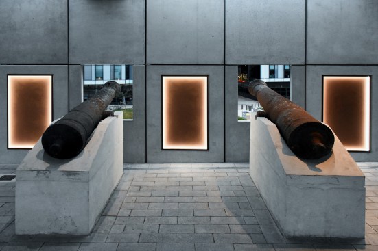The materials palette includes a selection of hardy materials that suit the robust nature of the park, namely, concrete, stone and steel. Concrete was chosen as a “material of our time” for new structures as it can be clearly distinguished from historic elements, ensuing little misinterpretation. A precast concrete panel structure dubbed the interpretation pavilion has been built to the estimated height of the battery’s original walls and links the park, piazza and parking facility via internal elevators. To resemble cannon embrasures, three small openings form part of the structure’s canal-facing wall. Historic cannons from Amsterdam Battery found scattered throughout the V&A by the Cannon Association of South Africa and preserved for the development of the park are now on display inside the interpretation pavilion. The artefacts sit on top of precast concrete plinths, made to resemble old timber cannon carriages, allowing them to protrude through the embrasures and overlook the canal.