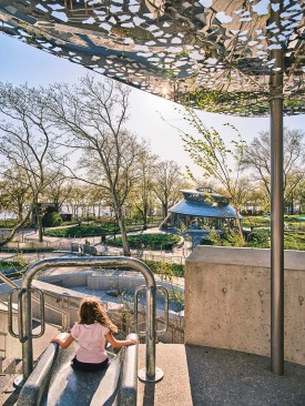 The ecological story begins with The Battery’s location at the prow of Manhattan where the Hudson River meets New York Harbor. Created by successive landfills over several centuries, much of the park, including the playground, is low-lying land, vulnerable to storm surge, high winds, and in-land flooding. The project will tangibly demonstrate how the best practices of resilient design can offer a rich play experience – one that deeply connects children to natural elements and the realities of climate change, while expanding their creative capacity. In the proposed design, impermeable paving visibly directs surface runoff to verdant raingardens crisscrossed by foot bridges, integrating environmental management practices into the very heart of the play experience. Plants will play a key role in increasing the resiliency of the site while also fostering visitors’ connection to nature. The landscape design will feature diverse, seasonal plants that are aromatic and tactile, encouraging closer inspection. Specific plants were selected for their durability and high salt tolerance, due to flooding risks.