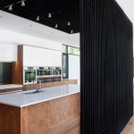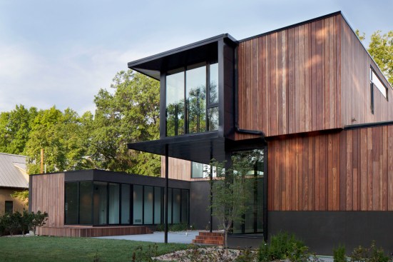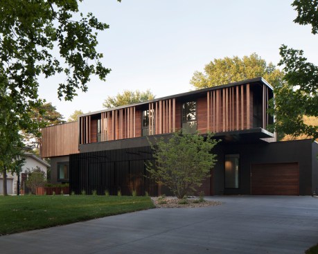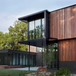 Baulinder Haus is located just a few houses down from a landmark Kansas City area home designed by Bauhaus architect Marcel Breuer. Baulinder Haus draws inspiration from the details of the neighboring home. Vertically oriented wood siding, simple forms, and overhanging masses—these were part of Breuer’s modernist palette. The house’s form consists of a series of stacked boxes, with public spaces on the ground level and private spaces in the boxes above. The boxes are oriented in a U-shaped plan to create a generous private courtyard. This was designed as an extension of the interior living space, blurring the boundaries between indoors and outdoors.