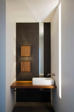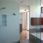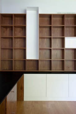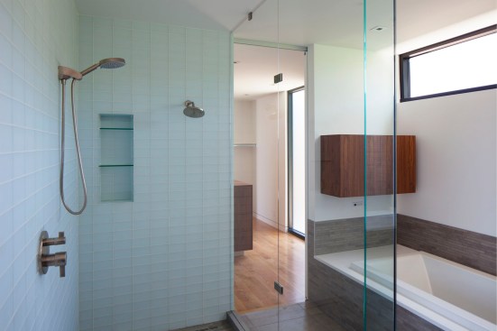 Floor-to-ceiling south facing windows in the courtyard are shaded by the overhanging second floor above to prohibit solar heat gain, but allow for passive solar heating in the winter. Other sustainable elements of the home include a geothermal heat pump HVAC system, energy efficient windows and sprayed foam insulation. The exterior wood is a vertical shiplap siding milled from FSC certified Machiche. Baulinder Haus was designed to meet and exceed requirements put forward by the U.S. Environmental Protection Agency for their Indoor airPLUS qualified homes, and is working toward Energy Star qualification.