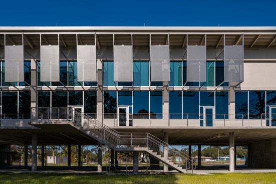 Sun screening devices are used strategically within the design to allow views through while offering some relief from the Florida sun.
