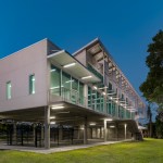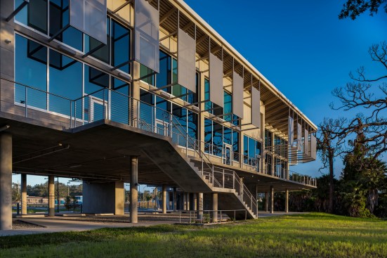 The building rises above grade in response to its location within a flood zone; it utilizes this requirement to its advantage raising the programmed floor plate higher than the required minimum, allowing users to view more of the natural features of the site beyond the immediate context to the surrounding wetlands and water’s edge.