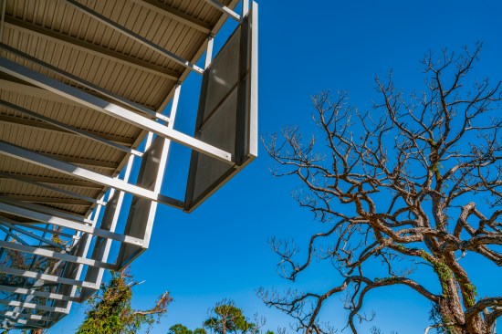 Rising 12 feet above grade, the facility gains views out to the immediate context and the surrounding ecosystems and water’s edge to the east above the existing tree canopy and wetlands. As one moves from the entry side to the water side–from west to east–the roof plane rises accommodating large glazed openings with views that reach out to the water and the natural features of the site.