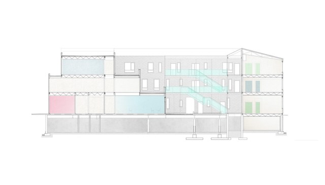 More importantly, the building’s true motivation is to carry out a decidedly urban program: The 100 occupants of the building’s 30 studio to three-bedroom units all rely on shared amenities—a communal dining room, recreation spaces, kitchen, even rooms for art classes. This cohousing scheme was developed by the residents, who pooled resources to form the client entity. A participatory design process ensured each voice was heard and individual needs accounted for.