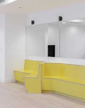 The building’s 30 units range from studios to three-bedrooms, and the ownership model is similar to that of a condominium complex. The difference, of course, is the emphasis on collective space. The dining room—connected to the shared living area, the central outdoor patio, and the common kitchen, which residents can use for cooking weekly group meals—anchors the building as one of the largest common areas. With 100 seats, it could just as easily host a combined Thanksgiving dinner as it could offer a casual workspace for remote workers. The room’s bright yellow banquette serves as a transitional tool—it can seat many or be used by smaller groups for more intimate conversations. “When there aren’t 100 people in there, and you’re in there working, drinking coffee, or hanging out with kids, how do you not feel like you’re in a cafeteria or a space that’s just out-scaled for you?” Jenny says of the colorful design detail.