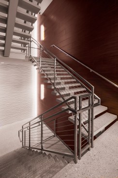 Gresham Smith’s design implements thoughtful solutions to improve building performance and user comfort while adhering to a tight budget. The building materials, which include panelized structural components and a concrete exterior façade, are part of an economical system that also supports long-term cost savings. The pragmatic application of vertical shading devices responds to varying solar intensities and exposures by shielding the sun where necessary. Horizontal screens both provide shade and reflect light into the open office areas. Such strategies result in a building that is over 60% more efficient that average building stock in the Tampa area.