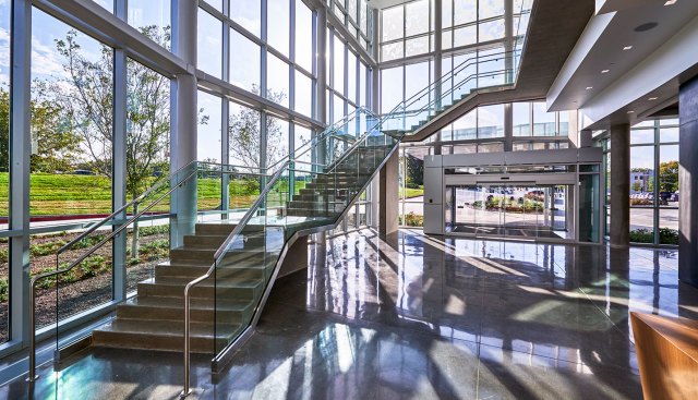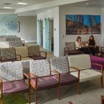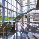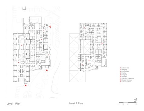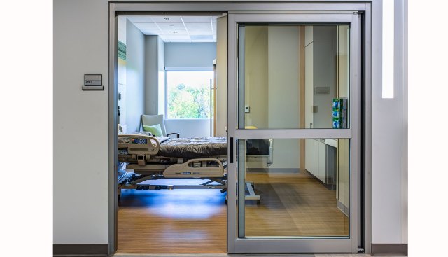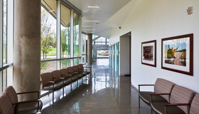 The curtain wall then drops to a one-story scale, beckoning patrons from the lobby and leading them along a glass path to department entry points and waiting areas. The first floor contains pre-admit, diagnostic imaging, emergency, building support services, and 10 operating rooms that support surgical services. The design provides an opportunity for expansion of the surgical suite if demand increases in the future. Family and guest respite areas are provided near surgical services with interior and exterior lounge areas that provide adjacent consultation rooms, and a private discharge route when they are reunited with their loved ones.