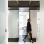The new two-story building lobby takes patients up to the glazed entrance of the dental clinic, a carefully framed threshold that leads into the light-filled waiting room and features the tones and colors dominating the interior – shades of white and grey with occasional accents of green, all calibrated to tie into the clinic’s overarching graphic identity. The green-lacquered top of the entry cabinet, a low-slung toy chest with a retractable surface for kids’ activities, peels away from the base and turns into a linear, suspended soffit that connects the reception area with the wood-paneled consultation room located in the center of the clinic.