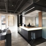 Optimized procedural flow strategies informed the layout of patient rooms, laboratories, staff offices, and sanitary infrastructure. The reception desk greets incoming patients and complements the formal vocabulary of clean lines and folding surfaces first introduced at the entrance. The reception’s monolithic, dark-grey volume transforms into a thin, continuous ceiling plane that functions as the dental office’s organizational back bone and establishes the central circulation spine, essentially bifurcating the clinic into a zone of operatories on one side and back-of-house spaces on the other.