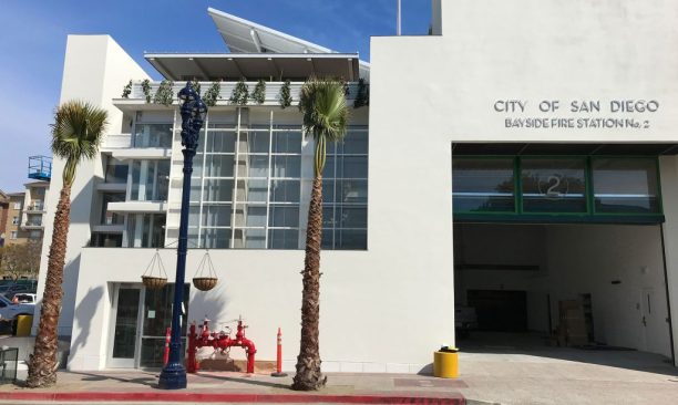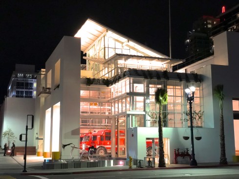 The Bayside Fire Station, located in San Diego’s Little Italy, solves a longstanding problem for the local Fire Department – meeting response times for the waterfront and mainly commercial and civic areas of downtown, west of the busy railroad and streetcar lines. Fire fighters and emergency personnel will now have direct access to the west edge of the city and the airport without delays at the train tracks. The 10,000 SF corner site met the location but was small considering an 18,000 SF building program and the need to provide on-site parking. CCDC, San Diego’s redevelopment agency, sought a local architect with extensive urban design and public building design experience. Although contemporary in design, it takes its cues from the nearby County Administration Building using the same Golden Section proportioning system and similar tile and brass accent detailing. Most fire stations, new or old, are rather introverted in nature. By contrast, Bayside embraces the community with a street level plaza, transparent apparatus bays and a third floor deck making the fire fighters more a part of the neighborhood. The programming, urban design and exploration for an efficient small site design solution resulted in an unusual three-story house scheme, with three drive-through apparatus bays on the ground floor over an underground parking garage. Firefighter dorms and common areas are on the second and third floors, connected by both a slide and poles to the apparatus bay. The firm worked with artist team Ingram Ober and Marisol Rendon to develop a sculpture on the sidewalk corner providing seating while conveying stories of the firefighters.