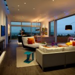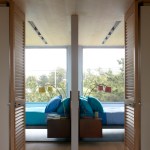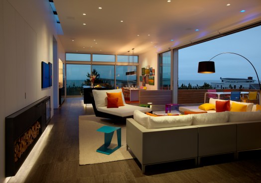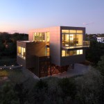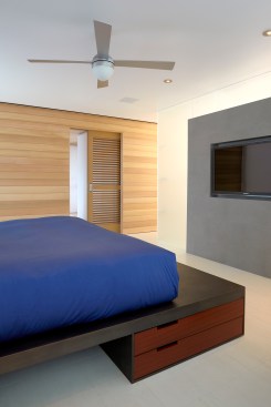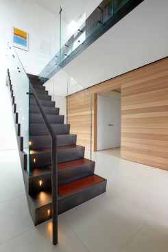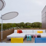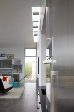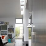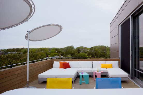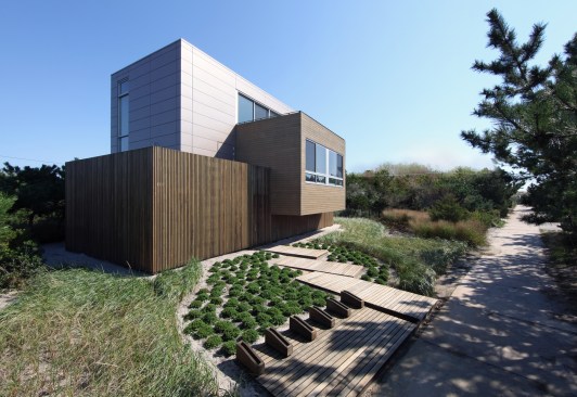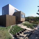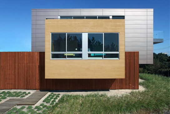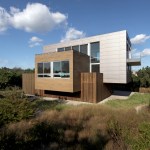 This Fire Island house is located directly behind beach-front dunes. The strict requirements of both FEMA and local codes regarding height, lot line, setbacks, and site coverage; the proximity of neighbors; and very specific view corridors all presented a host of challenges. Our response was to create a dynamic composition of three intersecting rectilinear forms, which is rotated on the site off the prevailing grid. This decision maximized both views and privacy. The volume at grade is delineated by dark, vertically slatted, wood breakaway walls, which obscure the support pilings and provide storage for water sports equipment. The center volume, clad in horizontal wood siding, houses bedrooms & baths and provides roof decks for the living level. The metallic clad upper volume contains a large, open-plan living space with spectacular water views.