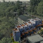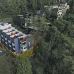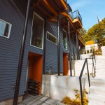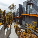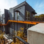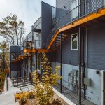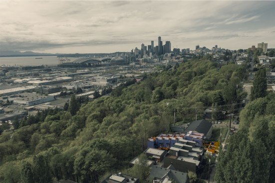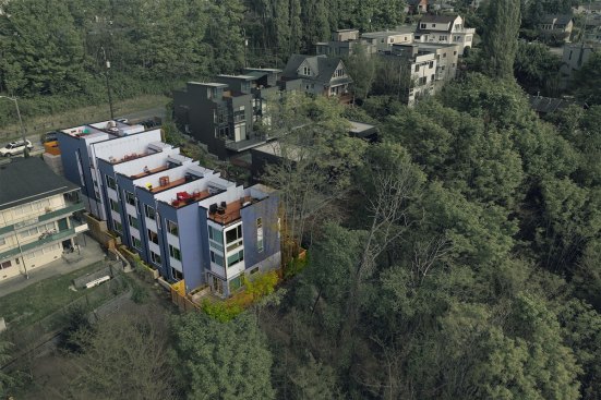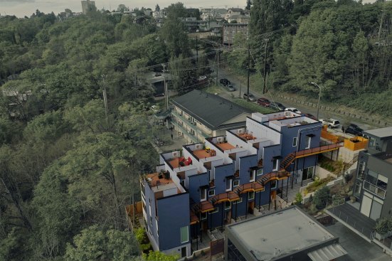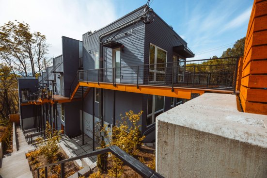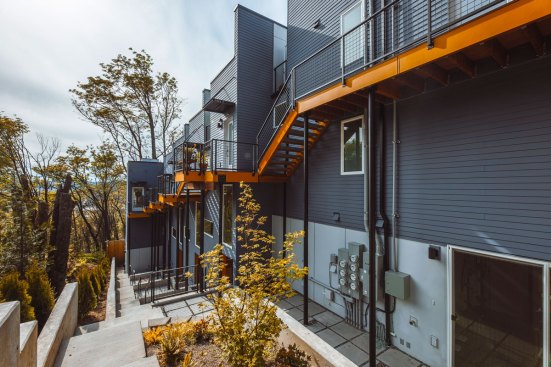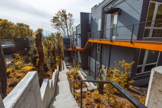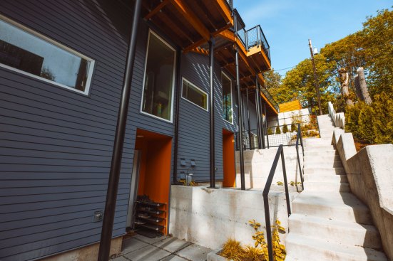 Embracing the challenges posed by a thirty-five-foot topography change from the street to the rear of the site, a reverse living strategy was employed for this seven unit townhome building. The living level was relocated to the third floor where all units were connected by an elevated walkway. To minimize site disturbance and reveal westerly views, the units step down the hillside with the existing topography.