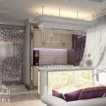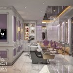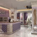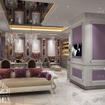 Colors chosen for the decor were hues of elegant purple, lavender, and ivory, with some golden elements in decor. Classic style bespoke furniture with velvet upholstery, elaborate wall decor work, and chic chandeliers create an atmosphere of luxury and glamour.