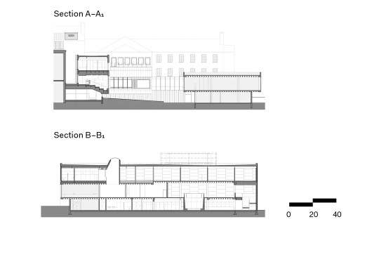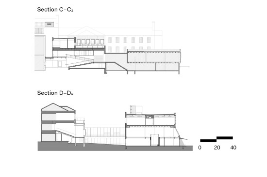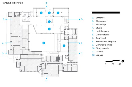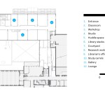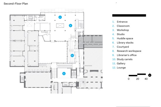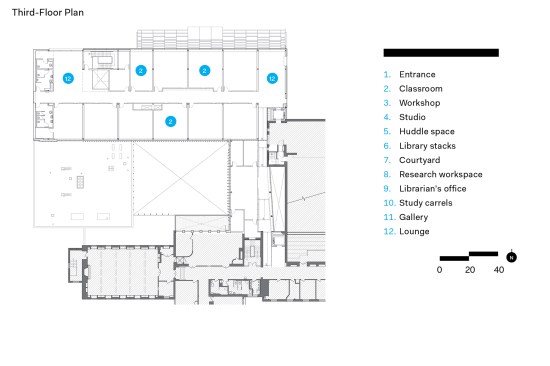 Tehrani: We added one floor at the very top of the existing library structure, and the rest of the project is about carving out existing conditions and elongating them because of the way it wraps around the courtyard. Spatial typologies that would otherwise be cut up into rooms were attenuated into these long stringy conditions of stairs and ramps. Along that journey you get study carrels and bleachers, and things like that.