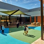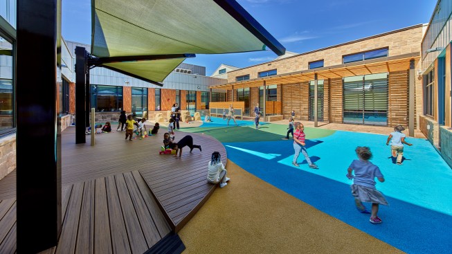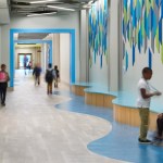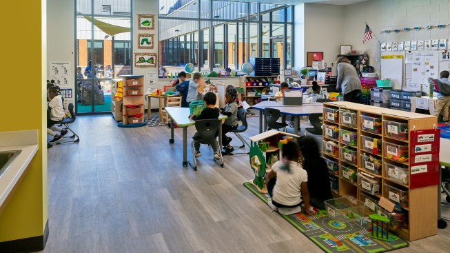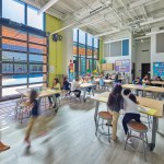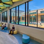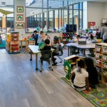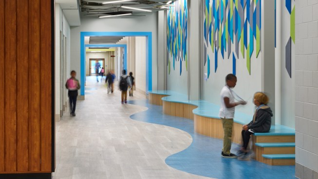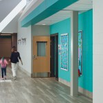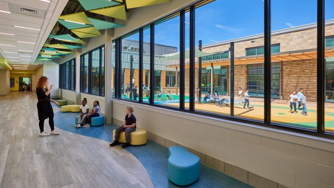 Serving grades Pre-K through 2, the interior layout of the building allows for separation of classrooms from shared spaces. A Pre-K and Kindergarten classroom cluster surrounds one courtyard and a Grades 1 and 2 classroom cluster surrounds another courtyard. The two classroom clusters are linked together by special education, resource, and intervention rooms. A main corridor extends the length of the building in the east-west direction with classrooms to the south and shared spaces to the north. Administration and community-use spaces (the media center, cafeteria, and gymnasium), located north of the main corridor, can be locked off from the classroom clusters for after-hours community use.