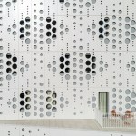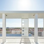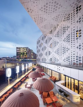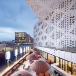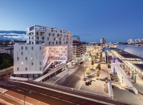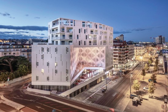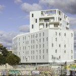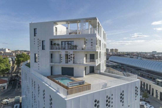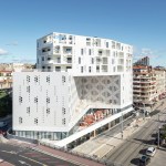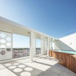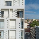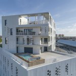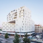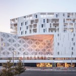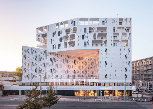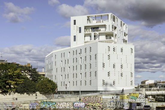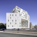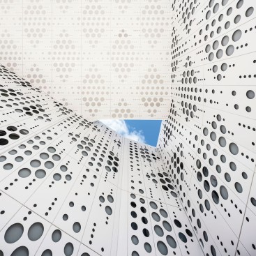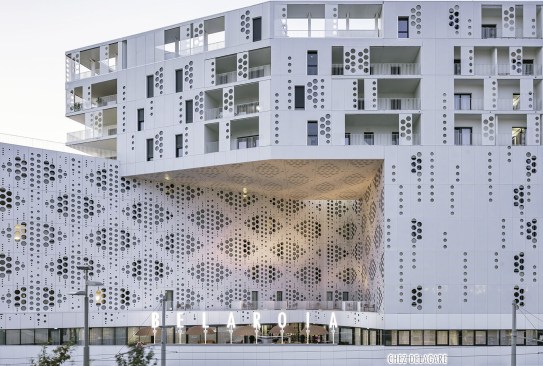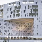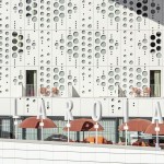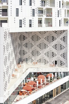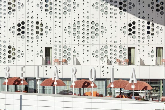 The facades were designed so as to envelope the whole project in a homogenous cladding system, generally covering external insulation. This cladding was designed to cater for the different functions that it covers: opaque or micro-perforated over the solid areas, perforated with large round openings in front of the windows of the hotel rooms, and finally sliding to shelter the north- and south-side terraces of the apartments, providing privacy and shade. Their white colour minimises heat absorption.
