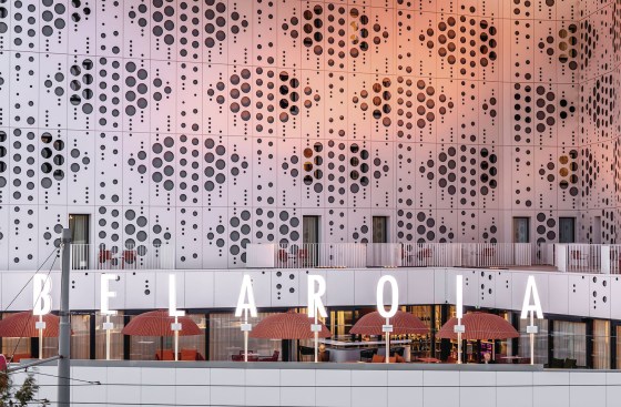The programme is both simple and rich: the breakfast room of the 4-star hotel, a place for eating at any time of day and a fantastic bar in the evening, lit up by the giant luminous letters of BELAROIA.