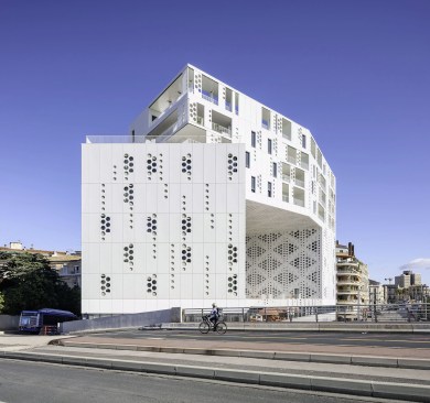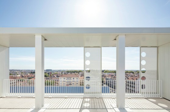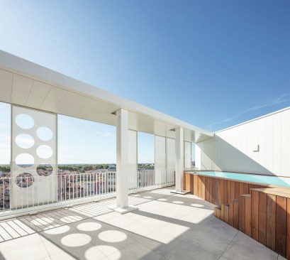 All the volumes are covered with a single cladding system to ensure simplicity and unity of form. On the upper section, this cladding is partly made up of sliding panels to shelter the apartments’ terraces, and then on the top floor the generous open-air terraces of the split-level apartments.