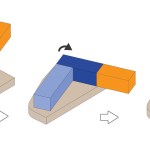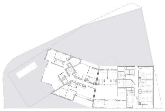 The complex triangular form of the site led us to design a continuous volume with a succession of folds that unfurl along the north and the east facades, topped by a wide bridge along the south facade.