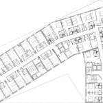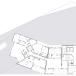 The ground floor of the project tucks in along the retaining wall of the Pont de Sète road bridge and aligns with the two other edges of the site. It is consequently partially below ground and enclosed along the bridge side, more generously open on the east and south sides, where it incorporates the entrances for each programme. Consequently, from north to south are the following: – On the north, the Campanile Hotel entrance and the entrance to the underground car park, – On the east, the Golden Tulip Hotel entrance and one of the two entrances to the restaurant, – On the south, the main entrance to the restaurant and the entrance to the apartments.