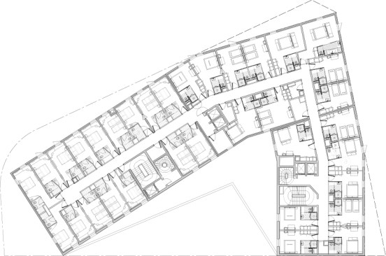 Its particular position is in fact on the prow of the Nouveau Saint-Roch development zone, and the fi rst of the zone’s projects to be completed. To characterise this zone, the city highlighted the importance of a diversity of programmes, which our team interpreted as a hybrid project, interweaving two hotels, apartments, a seminar venue and an independent restaurant.