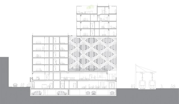 The lower edge of the three-dimensional truss is dressed in steel tray, flocked on their underside and the covered in micro-perforated cladding with the same pattern as the facade. The upper floors are braced by a cross of St Andrew. Overall stability is reinforced by the concrete slab of the roof.