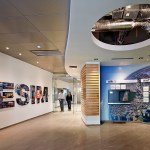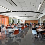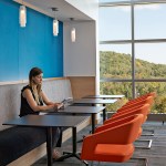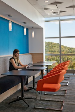 Immediately upon entry, the lobby reflects Belimo’s commitment to the customer with a well-appointed, two-story customer lounge space and interactive product display area. Belimo is proud of its products, thus company products such as bright orange actuators can be viewed in intentionally exposed ceiling plenum vignettes throughout the facilities. Brand colors are strategically integrated both inside and out through the project palette and material selections. Bright white surfaces are combined with medium value, small pattern gray flooring, and natural maple veneers to focus the eye on accents of Belimo’s orange and blue color scheme. The open office environment is not new to this company; however, in the new space it is achieved without the traditional tall panel systems detrimental to communication and efficiency. The low-profile office furniture prevents isolation and allows for ease of collaboration, and teaming. Although individual work areas are assigned, the workplace design strategy was to provide options and choices of work settings for team-based and individual “heads-down” work. Huddle rooms, cafes, and soft seating areas invite staff to gather informally or focus on tasks. The office component is integrated with the manufacturing component through the sharing of design elements and finishes. The company’s manufacturing employees have direct access to office staff and share facilities such as the cafeteria, multifunction spaces, and the fitness center.