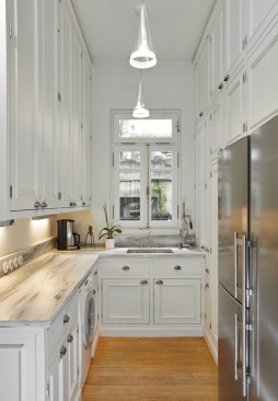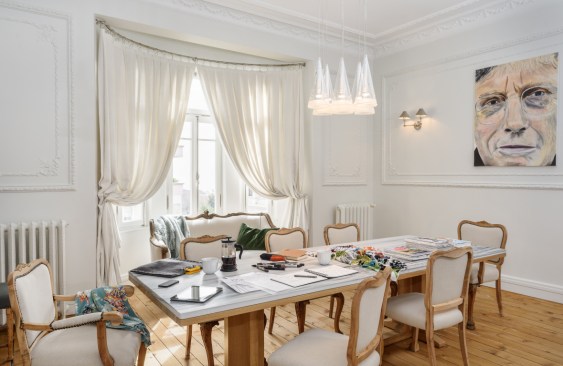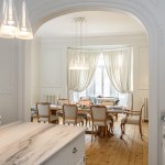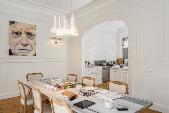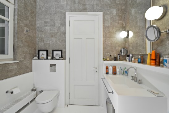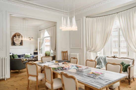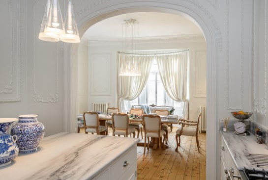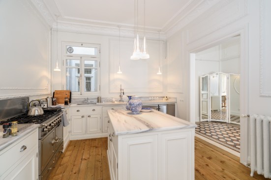 So, the first thing to do was to convert the flat back to its original. Then came the additions following the needs and desires. As an addition to the small kitchen space, a large one is placed in one of the living room sections just across the entrance. Both kitchens designed with huge sinks suitable for an English style cooking, based on oven cooking. Naturally a big La Cornue cooker takes its place in the center. Cabinets above are avoided, keeping the walls with the beedings clear and visible. Even no paintings had been preferred to be hung up in between them. All cabinets in white painted wood, with the same beeding detail and same handles all around following our client’s perception: ‘if I like something and think it is the right solution, then I will just keep up with it’. This also explains all Fucsia pendants by Castiglioni around the house; senary ones above the dining and coffee table, triple ones over the kitchen counter, in bedrooms and even in the bathrooms, and single ones all through the circulation areas. A similar approach was held on choosing the marble to be used in the house. The Marmara marble, the most common marble in Turkey, which we are used to seeing in hammams and even cemeteries was used. It took us days to find the most ordinary one, with smoky irregular patterns which is no longer craved for, but still existing in Istanbul’s century year old apartment buildings.