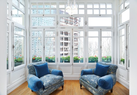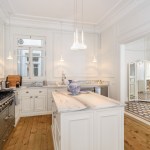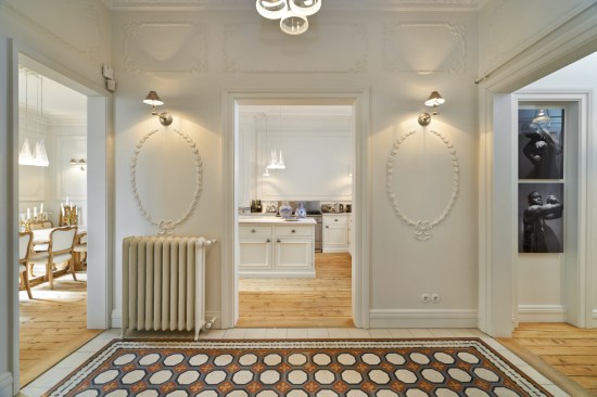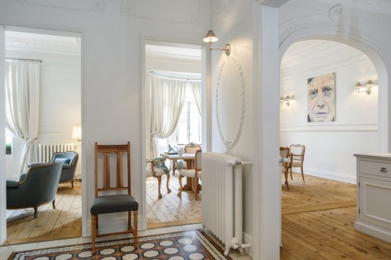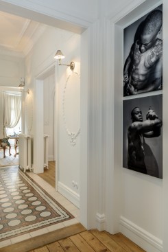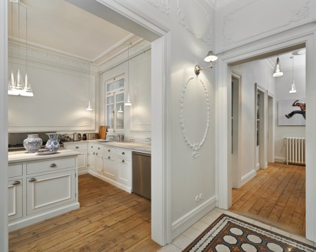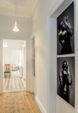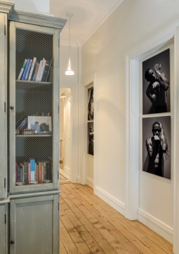 The recently changed third-class interior doors were removed and frames and reproduced ones in the style of the building’s period.To get light insideat most in the living area and circulation areas new door frames without the doors were fixed.The house is heated as a whole so dividing the living area in small parts is no longer necessary. With the help of the white paint all around, the house is full of light even in the darkest winter days.