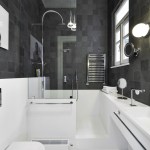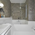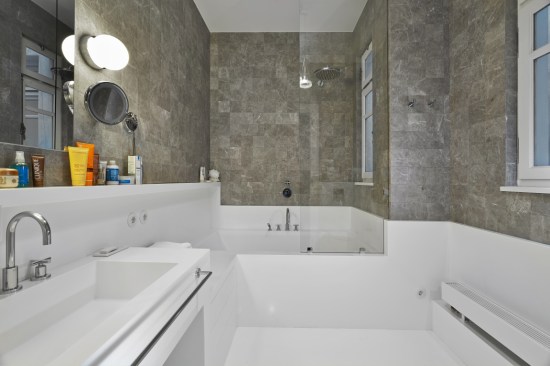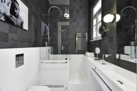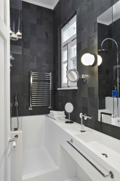 For the no longer existing bathrooms it was come up with a simple, modern idea; shaping up all surfaces below splash level with Corian, creating the floor, walls, tub, shower and sinks. Above the level is covered with stones up to the ceiling. Blackslate was used in the guest bathroom, and beige marble in the master bathroom.