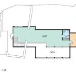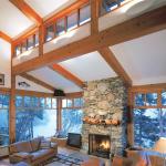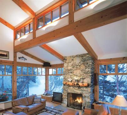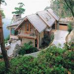 Viewed from the waters of Washington’s Chuckanut Bay some 75 feet below, this new house nestles deeply into its steep, wooded site. Seen at closer range, the relationship of site and architecture become even more intimately entwined. The entry courtyard, a narrow drive wedged between the building and the hillside, leads to a sandstone-faced garage that seems to grow out of the rocky slope. The garage mass forms the wide end of a stone-clad wedge that extends through the timber-framed house, separating public spaces from private. The stone walls, with their cast concrete lintels, provide an earthy contrast to the exposed wood structure and anchor the building on the site (literally as well as figuratively; the garage’s cast concrete shell retains the hillside above). Project architect Chris Bigos had to sell the idea to his clients, who had envisioned a pure post-and-beam structure. “That was kind of a challenge to them,” he says. But the combination of timber and stone flatters both modes of construction and gives the architect another tool with which to shape his clients’ experience of the house. Upon entering the house, Bigos says, “Your eye kind of follows that stone wall, to the water, to Bellingham Bay, to the San Juan Islands, and right out to the horizon.”