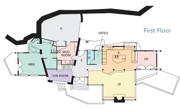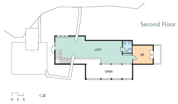 And the house is more than just a well-positioned viewing platform. While it “works wonderfully with the site,” our judges noted, it is also “a livable, comfortable space.” The fir timber frame balances openness with a sturdy and secure sense of enclosure. Cherry cabinetry and floors at the ground level give way to Douglas fir finishes at the second floor, which includes guest spaces and an informal weaving studio. Along with the stone walls, the madrone tree provides another site-related motif. A weathered madrone log found on the site became the living room fireplace mantel. The entry door was fashioned of madrone wood, its leaded glass sidelight and door lights depicting the twisting form of the same tree.