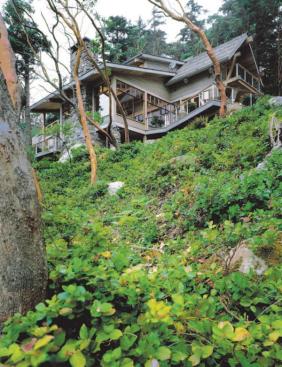 Because one approaches the house from above, Bigos made the roof another major design element. Its steep, telescoping gables echo the distant silhouette of the San Juans. Every seventh course of red cedar shingles is doubled, subtly breaking up the roof planes. On a site with virtually no level ground, Bigos carved out a bit of usable real estate by designing the flat garage roof as an elevated rock garden. Fixed skylights provide uphill views to balance the watery vistas in the opposite direction. But this site is a natural amphitheater, and there is no doubting the direction to the stage. Bigos made the bay-side walls a virtual open timber frame, with fixed glass spanning from post to post. Water views, veined with the sinuous orange trunks of the native madrone trees, wrap halfway around the house. Three decks—along with the rooftop rock garden—each offer a subtly different outdoor experience.