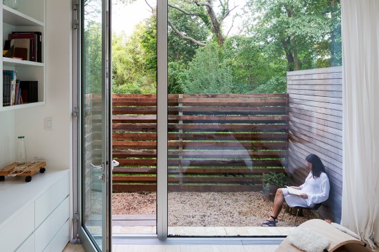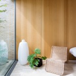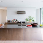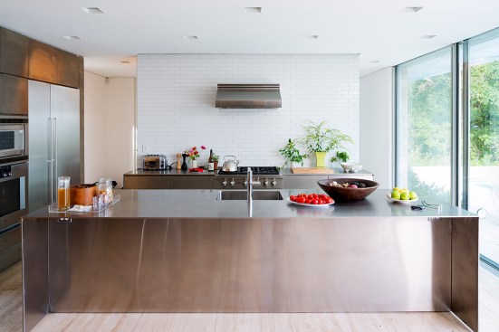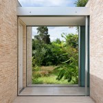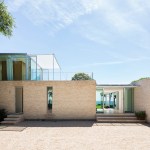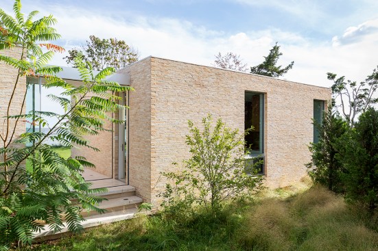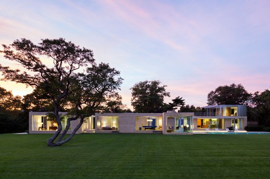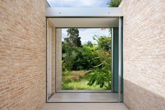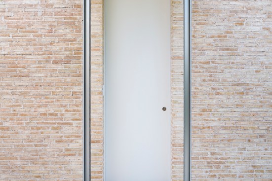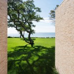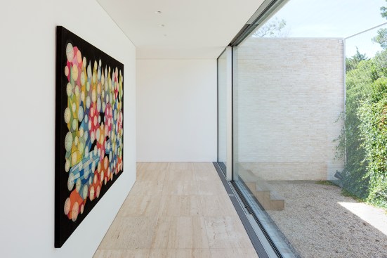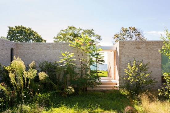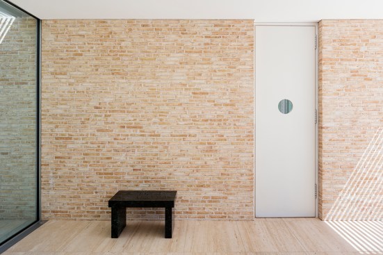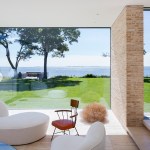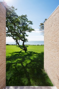 The exterior walls are built with clay bricks that are robust against the salty ocean air and the freeze/thaw cycles of the cold damp Long Island winters. It also provides a thermal mass for more efficient heating and cooling. The bricks are stacked in a random pattern to break its rigidity and give a more fluid feel to its clay materiality. The floors are open vein-cut travertine slabs with radiant heating for thermal comfort. Even with all the glass, the radiant floors provide even and efficient heating throughout the Fall and Winter. The open veins of the travertine give a refined roughness that reminds you of the geological process that creates natural stone within the earth.