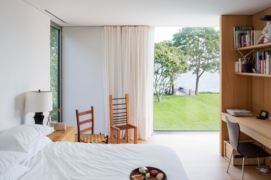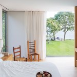 There are five bedrooms each with their own bathroom, so guests can retreat and have their privacy when desired. The second floor bedroom also has a roof deck and views that provide a different perspective of the property and house from above. Expansive glass from floor to ceiling with glass doors provides uninterrupted views and access to outside from all the bedrooms. And each bedroom has its own unique view and experience of the landscape around the house.