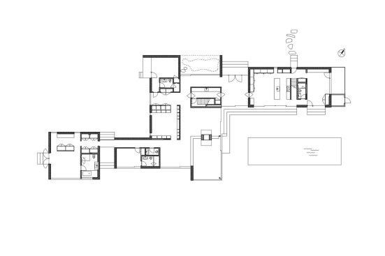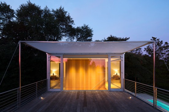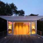 This weekend home, built on the south shore of Long Island, is envisioned as a social platform for the owner, his family and many friends and guests who come to visit and enjoy themselves outside of New York City. The Entry, Living, Dining and Kitchen are the central core where the social activity mixes. Large sliding glass doors open these areas out to the exterior, allowing people to flow easily between inside and outside. The pool, waterfront and various landscapes and courtyards around the house provide multiple settings for various activities. People can meander as the daylight shifts throughout and around the house over the course of the day, feeling the distinct presence and syncopation of morning, afternoon, sunset and evening.