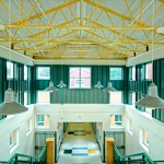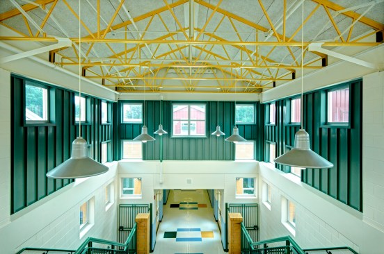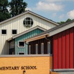 The 77,000-square-foot facility features 18,000 square feet of 12” x 1.5” Petersen Aluminum metal wall panels and 2,500 square feet of soffit panels. The designers chose a palette of four colors—Hemlock Green, Colonial Red, Sandstone and Slate Gray—to echo the colors used on the area’s traditional homes. And by using Valspar’s Fluropon coatings on the metal panels the designers ensured that the colors will stay vivid and true for years to come. This was an especially important consideration for the Bells Mill project, where community input had a large role in the color selection, with parents and neighborhood residents weighing in on the choices during several planning meetings.