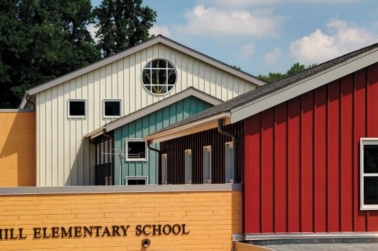 In the design for Bells Mill Elementary School in Potomac, Maryland, WMCRP Architects drew on both historic and modern influences. The colorful complex features a brick and metal exterior that brings together colonial, schoolhouse and farmhouse design elements that complement this historic and affluent community.