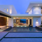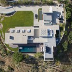 A spiral driveway leads to the property and car park, where wide horizontal pavers guide the eye to the house. Water surrounds the entrance, flowing between the steps, and meeting a rough textured stacked-stone wall. The large center-pivot front door opens to reveal the dramatic foyer, capped by a double-height box, 20’x 20’, accented with ribbon windows to the north and south, and skylights overhead. Look straight ahead out beyond the patio, for a perfectly framed view of the California hills.