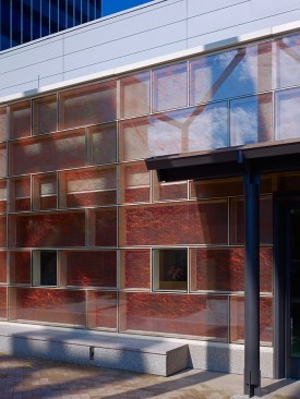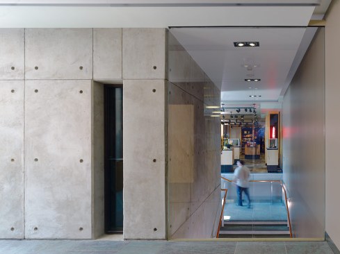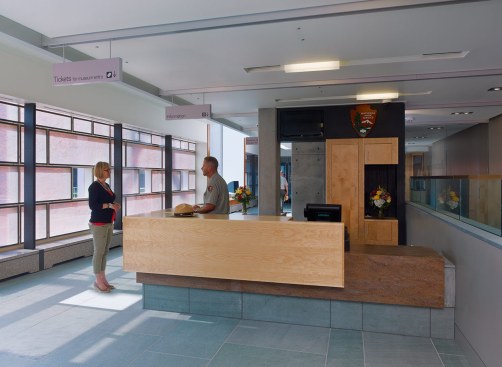 The renovation and expansion project presented the opportunity for the creation of an inviting and accessible entry building that seeks to contribute to Franklin Court’s “entourage” yet be differentiated from the original elements. Venturi’s entry building elements (canvas canopy and brick façade) are reinterpreted in steel and frit-pattern glazing. Capturing space from the original canopy footprint provides for a Court-level lobby and graceful, day lit, transition stair to the galleries below.